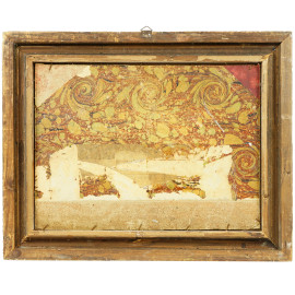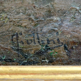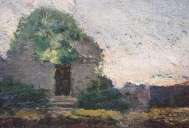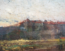 Paesaggio con casolare, olio su tela applicata su cartone, firmato, cm 27,5x36,5, entro cornice