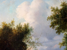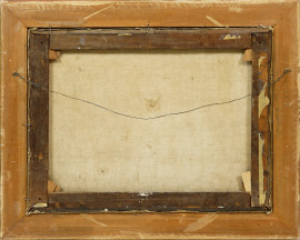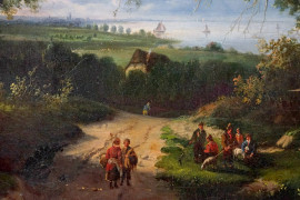 Paesaggio con figure in sosta, olio su tela, cm 49x65.5, firmato in basso a sinistra, XIX secolo, entro cornice