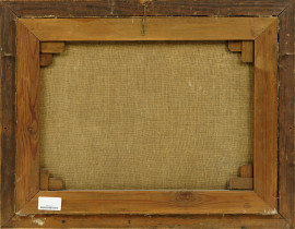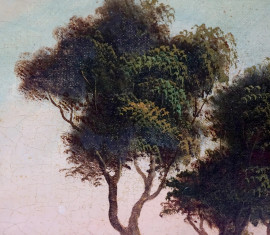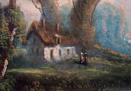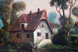 Paesaggio fluviale con case, olio su tela, XX secolo, cm 48,8x64,8, entro cornice