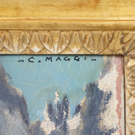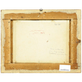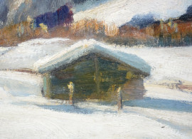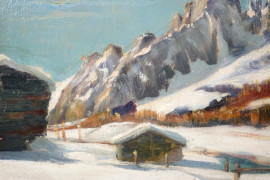 Paesaggio montano con baita, olio su cartoncino, firmato in alto a destra, cm 23x30, entro cornice