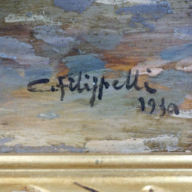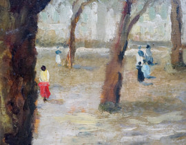 Parco con figure, olio su compensato, firmato e datato, cm 45x30, entro cornice