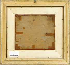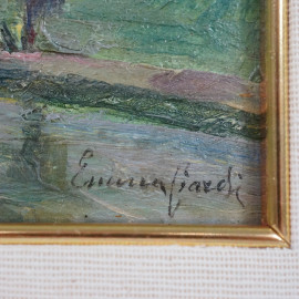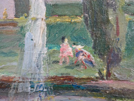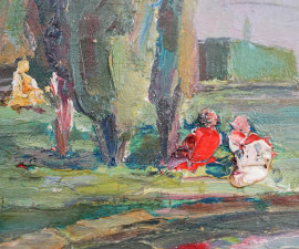 Parco con figure, olio su tavola, firmato, cm 20,5x23,5, entro cornice