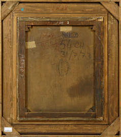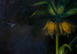 Pittore del XIX-XX secolo, Natura morta con Fritillaria Imperialis, fiori, pane e brocca, olio su tela, cm 76x63, entro cornice