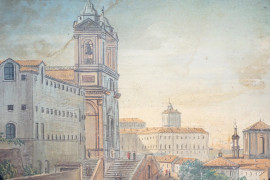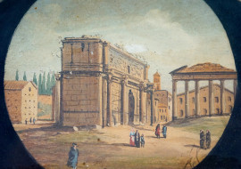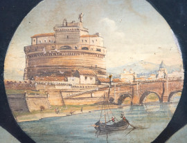 Quattro vedute di Roma ad assetto circolare, tempera su pergamena, diametro max cm 14.5, misura totale cm 25x32, entro cornice (difetti)