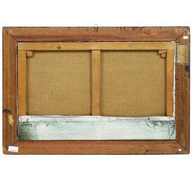 La tela è stata adattata ad un telaio di dimensioni più piccole e girata sul retro lungo la parte inferiore.