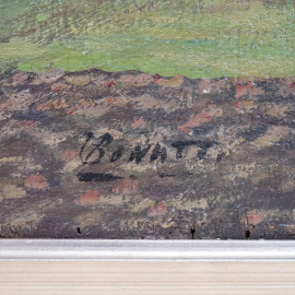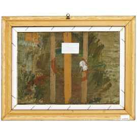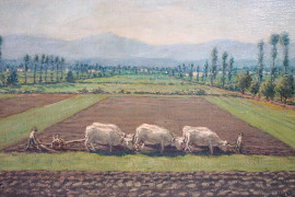 Scena di campagna con buoi che tirano l'aratro, olio su tavola, firmato in basso a sinistra, cm 47,5x67, entro cornice
