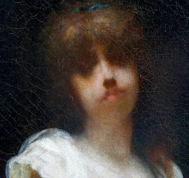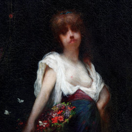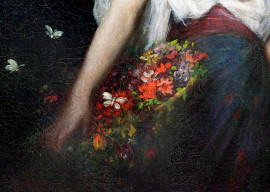 GIOVANE DONNA CON FIORI, OLIO SU TELA, CM 110X71, FIRMATO IN BASSO A SINISTRA E DATATO 1884, ENTRO CORNICE