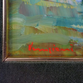 Scorcio di bosco, olio su lastra in metallo dorato, cm 21,5x16, firmato Veneziani, entro cornice