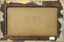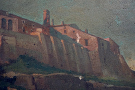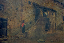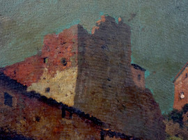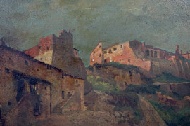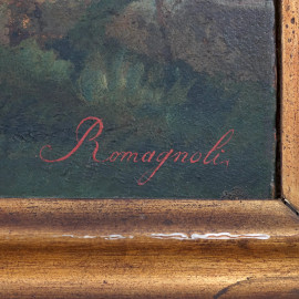 Scorcio di Corbara, olio su tavoletta applicata su cartone, firmato in basso a destra Romagnoli, reca iscrizione sul retro con data 1888, cm 31x56, entro cornice