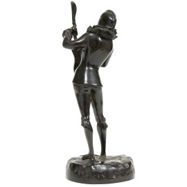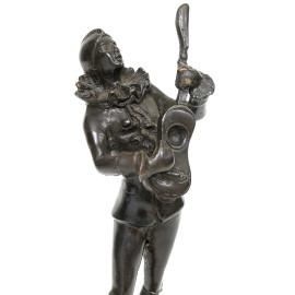 Scultura in bronzo brunito raffigurante Pierrot che suona la chitarra, XX secolo, altezza cm 32