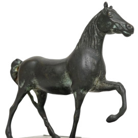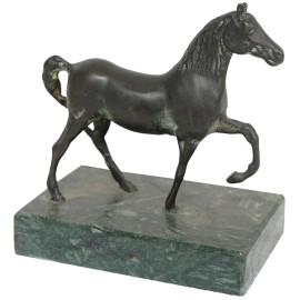 Scultura in bronzo raffigurante un cavallo, base in marmo, inizio del XX secolo, cm 16,5x15,5x10,5