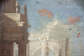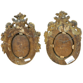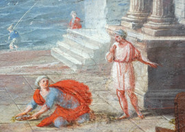 Scuola napoletana del XVII-XVIII secolo, coppia di vedute marine con capricci architettonici e figure, olio su carta applicata su tavoletta, cm 15x12,5, entro cornici