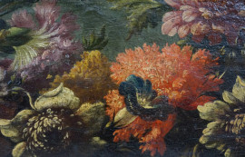 Scuola romana tra XVII-XVIII secolo, Ghirlanda di fiori e farfalle, olio su tavola, cm 56x56, entro cornice (difetti)