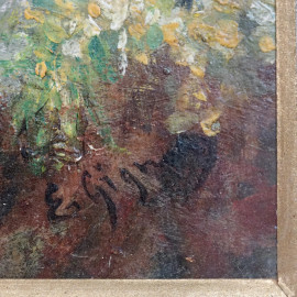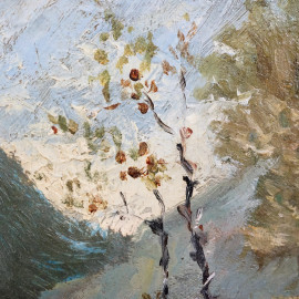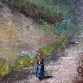 Sentiero montano con figura, olio su cartone, firmato, cm 19x12, entro cornice
