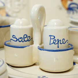 composto da: 1 zuppiera, 10 piatti fondi, 8 piatti piani, 4 bicchieri, 9 vassoi di misure diverse, set olio/aceto e sale/pepe, 2 portauovo, 4 posate da portata, 2 barattoli, 1 alzata, 12 cestino, 1 fruttiera, 1 zuccheriera, 4 tazzine da caffè