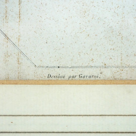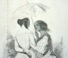 Stampa raffigurante due figure femminili con l'ombrello, da Paul Gavarni (Francia, 1804 – 1866), misure compreso passepartout cm 34x24, entro cornice