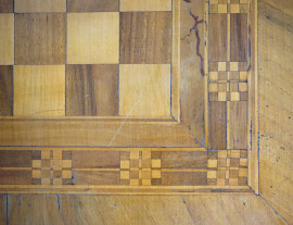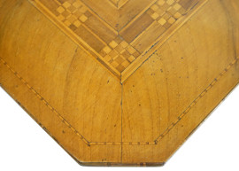 Tavolino da gioco con piano intarsiato a scacchiera, poggiante su una gamba con tre piedi, XIX secolo, cm h 76x60x60,5, (difetti)