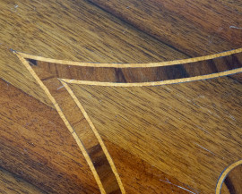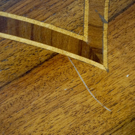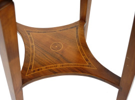 Tavolino in legno impiallacciato ed intarsiato, manifattura del XX secolo, con piano circolare poggiante su quattro gambe ad obelisco rovesciato raccordate da un piano, cm 75x64x48, (difetti)
