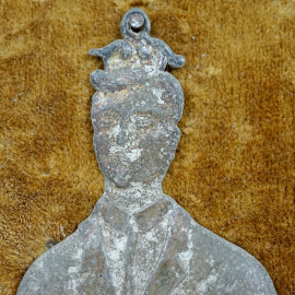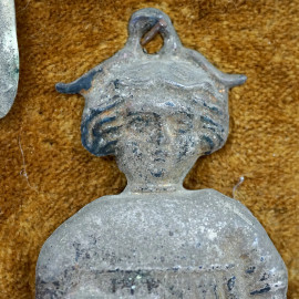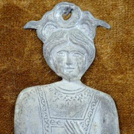 Tre ex voto in lamina di metallo argentato raffiguranti una figura maschile, una figura femminile e una bambina, manifattura italiana d'inizio XX secolo, misura max cm 22