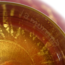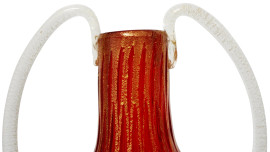 Vaso in vetro soffiato, La Murrina, Murano, XX secolo, color rosso rubino con inclusioni a foglia d'oro, anse e base in vetro trasparente, altezza cm 30