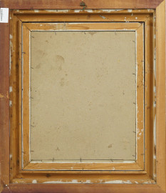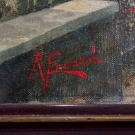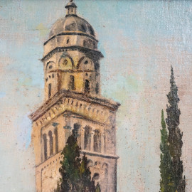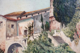 Veduta di monastero, olio su tela applicata su cartone, firmato, cm 50x40, entro cornice