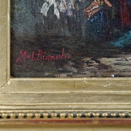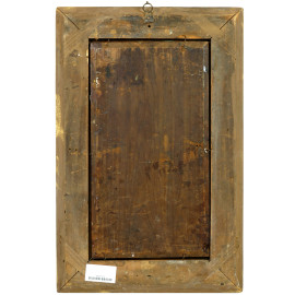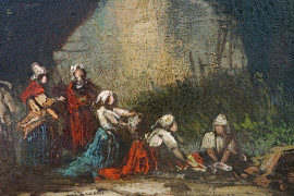 Veduta di paese con lavandaie, olio su tavola, firmato, cm 40,5x22, entro cornice