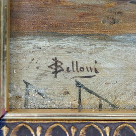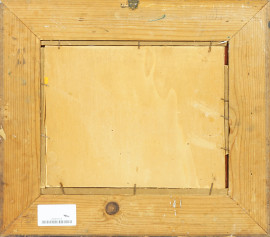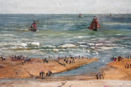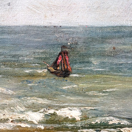 Veduta marina con figure e imbarcazioni, firmato, olio su tela riportata su compensato, firmato, cm 22x27, entro cornice