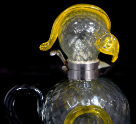 a sagoma di pappagallo, con fondo a reticolo e applicazioni in pasta di vetro gialla. Collo con cerniera in metallo.