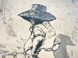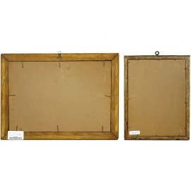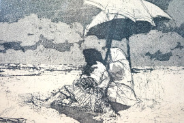 Donna accanto una bicicletta, esemplare 8/10, firmato e datato in basso a destra Vespignani [19]55; Due figure sulla spiaggia, Prova d'autore, firmato in basso a destra Vespignani 1955, tecnica ad acquaforte, misura max cm 26x37, entro cornici