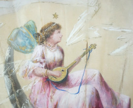 Vetaglio in stoffa dipinta a mano con figura femminile su mezzaluna, XX secolo, entro ventagliera, misure ingombro cm 53x85x6,5, (difetti)