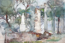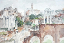 Coppia di vedute dei Fori, acquerelli su cartoncino, cm 35x48 e cm 35x51, firmati in basso a sinistra, entro cornice