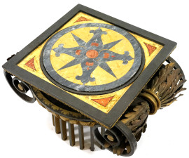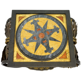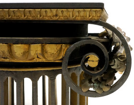 Capitello in ferro battuto con particolari dorati e piano con inserto in marmo, XX secolo, cm h 32x51x40, (difetti)
