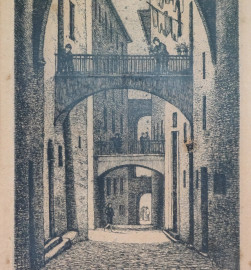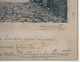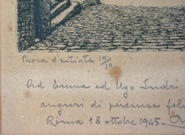 Scorcio di case, acquaforte (prova d'artista 10/10), cm 29x16, 1930, dedicato, firmato e datato "Roma 18 Ottobre 1945", entro cornice
