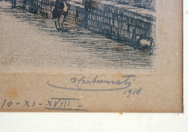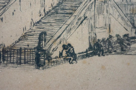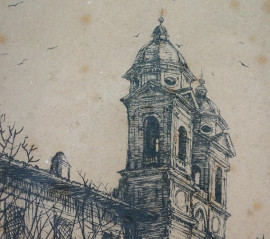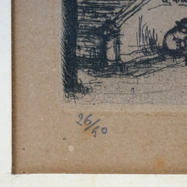 Trinità dei Monti, acquaforte (26/50), cm 23x25, 1918, firmato, dedicato e datato "Roma 10.XI.XVIII". Titolatoe iscritto "Roma" sul passepartout, entro cornice