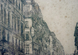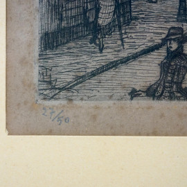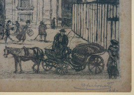 Via del Tritone a Roma, acquaforte (27/50), cm 27x29,5,1918, titolato e iscritto "Roma" sul passepartout, entro cornice