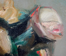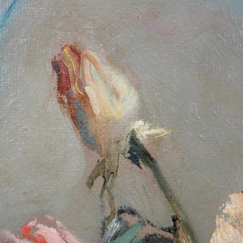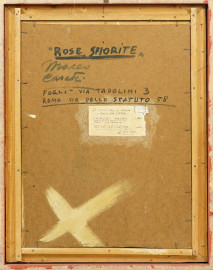 Rose sfiorite, olio su cartone telato, firmato e datato [1]955, cm 59,5x45,5, entro cornice