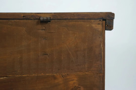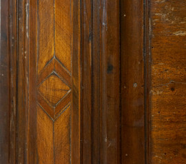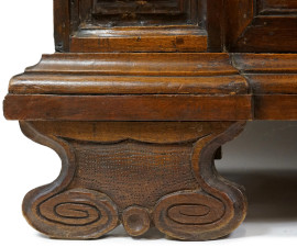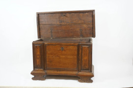 Cassapanca in noce costruita con elementi antichi, fronte con pannello liscio inquadrato da lesene intarsiate, piedi a ricciolo, XVIII-XIX secolo, cm h 62x46x100 (difetti)