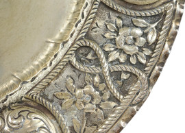 Centrotavola in metallo argentato con decori floreali cesellati, diametro cm 40