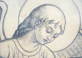 Studio di due angeli reggicartiglio, carboncino su carta, cm 44x101, entro cornice