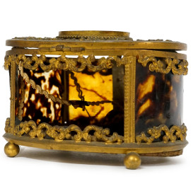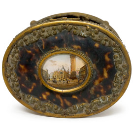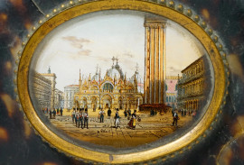 Cofanetto in bachelite e metallo dorato, coperchio decorato con miniatura di piazza San Marco, cm 9x12x14,5 (difetti)