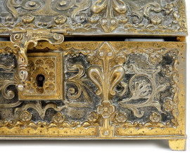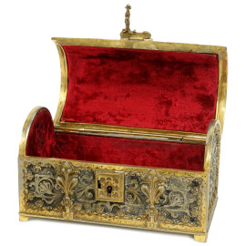 Cofanetto in metallo dorato e argentato con decori cesellati e a sbalzo, XX secolo, cm 11x10,5x19,3
