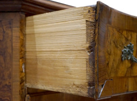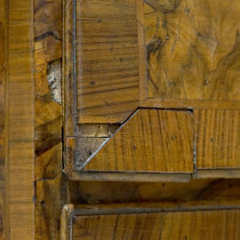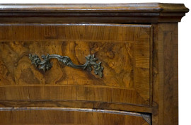 Comò in radica di noce a tre cassetti e fronte mosso, poggiante su quattro gambe mosse con piede a zoccolo, XVIII-XIX secolo, cm 97,5x126,5x64,5 (Difetti e piano sostituito)