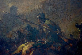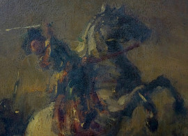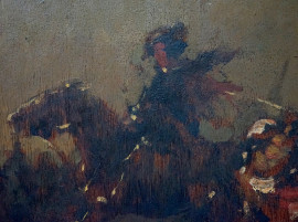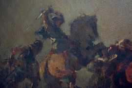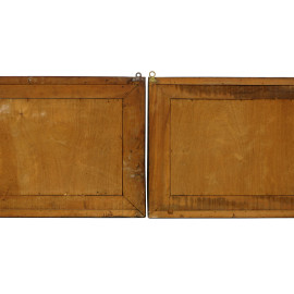 Coppia di battaglie, olio su compensato, fine XIX secolo, cm 38x119, entro cornice