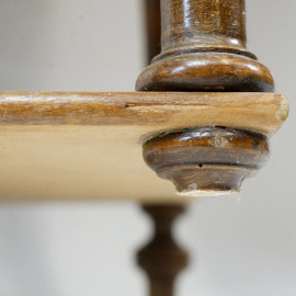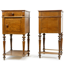 Coppia di comodini in legno chiaro, XX secolo, fronte ad un cassetto ed uno sportello, quattro gambe a rocchetto raccordate da treverse, cm h 81x40,5x40,5, (difetti)