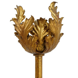 Coppia di lampade da terra in metallo dorato e legno con decori a foglie, poggianti su tre piedi, inizio XX secolo, altezza cm 117,5 (difetti)