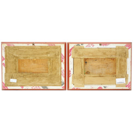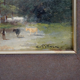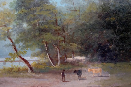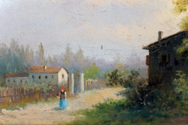 Coppia di paesaggi con figure, olio su compensato, cm 11,5x21,5, firmati, entro cornice. (Difetti)