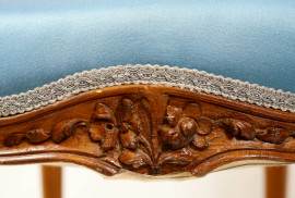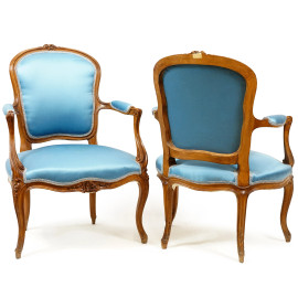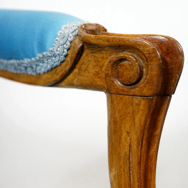 Coppia di poltroncine con struttura in noce intagliato, fine del XIX secolo, con sedute e schienali rivestiti in stoffa blue, cm h 84, (difetti)