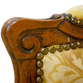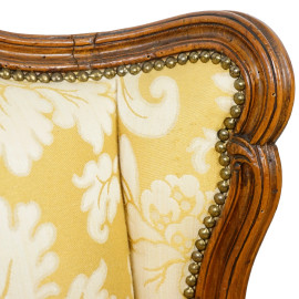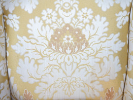 Coppia di poltroncine in legno intagliato con cuscini di seduta, rivestite in tessuto bianco e oro a motivi floreali, sec. XX, cm 86x68,5x57. (Difetti)