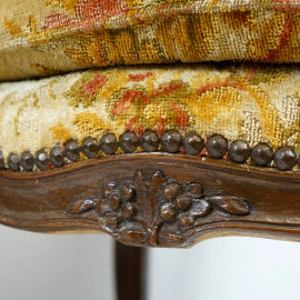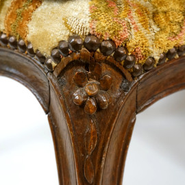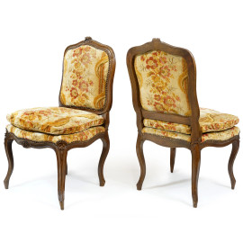 Coppia di sedie in legno di noce intagliato con decori a motivi floreali, seduta e schienali imbottiti, XVIII secolo, cm 90x42x42 (difetti)