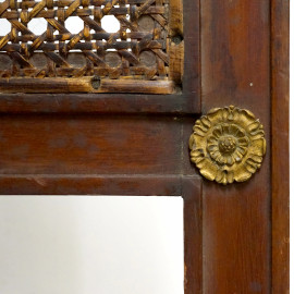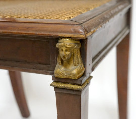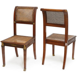 Coppia di sedie in stile Impero, in legno di mogano con schienale e sedute incannucciati, ferramenta in metallo dorato, cm h 94, (difetti)